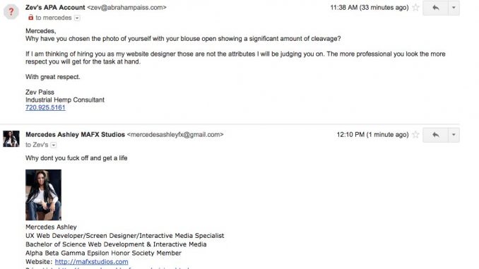 This hot head, Mercedes Ashley, walks around pissed off all the time and then wonders why she gets cancer. Potential clients should see how they will be treated if they hire her. This was a respectful email from a potential client that she for some reason made public after telling him to fuck off.