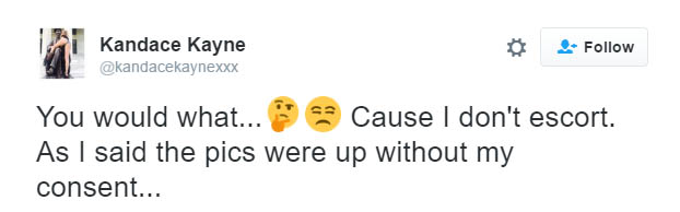 Kandace Kayne was briefly listed on the luxury companion escort website. After denying she was an escort, it later came out she in fact did ask them to list her. She filled out their application on their website and them emailed them some pics.